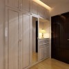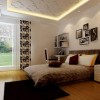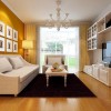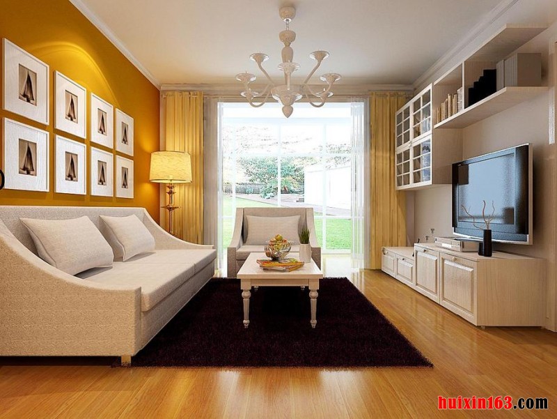 客厅的色彩搭配上注重比较浅的颜色,地面上是风格清新的原木色的地板,搭配灰白色的休闲简约风格的沙发,明黄色的墙面,在墙面的顶端还安装了一条明亮的灯带,墙面上铺设了两排白色变宽的图片,给人的感觉非常的优雅宁静。在客厅的顶面上悬挂了一盏白色的吊灯,色泽润滑的质感看起来就像是大理石雕琢而成的,提升了整个空间的档次。在电视背景墙上设计了一些吊柜和隔板的组合,电视柜的造型也是呈现出阶梯状的造型,让空间的层次感非常的好。