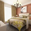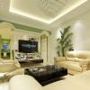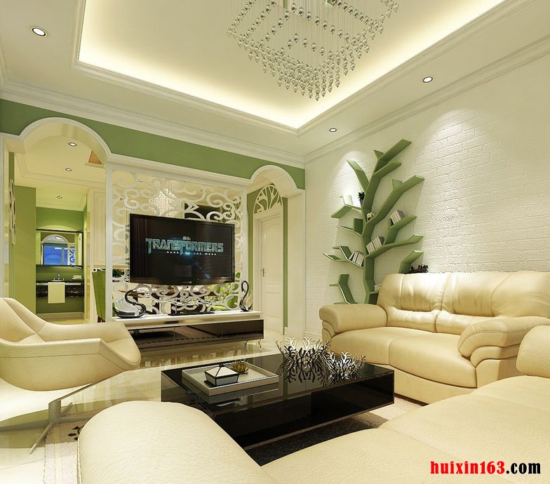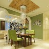 在客厅的顶面上设计了一个漂亮的水晶灯,水晶灯呈现出一个平顶的倒金子塔的构造,加上在周边设计的一圈明亮的灯带,给人一种简约时尚的感觉。在沙发背景墙上采用喷白的文化砖装饰,营造出轻松惬意可爱的格调,在沙发背景墙上设计的树形的隔断,具有一定的装饰性,同时也非常的美观。在电视背景墙上采用白色的镂空板装饰,在两边是白色门套装饰的拱门造型,在墙面上采用绿色的环保墙漆,空间整体装饰的氛围都非常的健康清新和优雅。