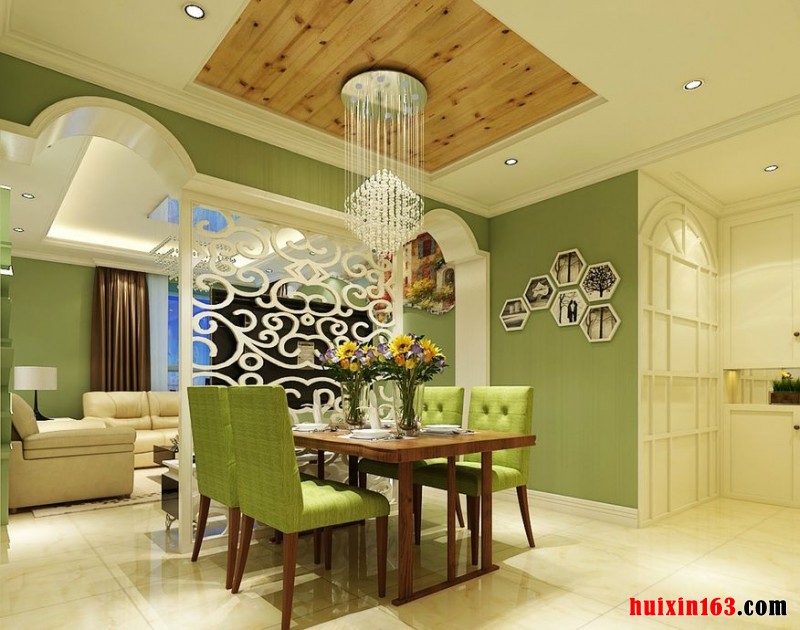 在客厅的顶面上设计了一个漂亮的水晶灯,水晶灯呈现出一个平顶的倒金子塔的构造,加上在周边设计的一圈明亮的灯带,给人一种简约时尚的感觉。在沙发背景墙上采用喷白的文化砖装饰,营造出轻松惬意可爱的格调,在沙发背景墙上设计的树形的隔断,具有一定的装饰性,同时也非常的美观。在电视背景墙上采用白色的镂空板装饰,在两边是白色门套装饰的拱门造型,在墙面上采用绿色的环保墙漆,空间整体装饰的氛围都非常的健康清新和优雅。