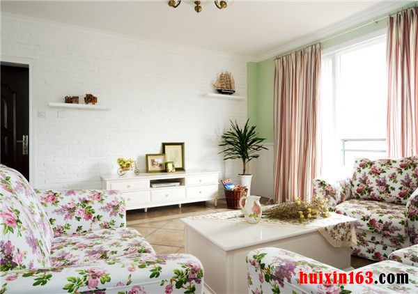 在客厅的顶面上采用了非常简洁的吊顶结构,一个黄铜色的吊灯,搭配白色的主灯和一圈优雅的喇叭花造型的小灯,就像是一朵盛开的白莲花,给人非常优雅温馨的感受。在电视背景墙上没有采用任何的装饰手法,白色的电视柜搭配墙面上白色的隔板,只是在隔板上摆放一些小摆件,电视柜旁边摆放一株绿植,在窗子的旁边也摆放一颗绿树,自然的清新气息就是家居装饰最好的调剂品。