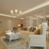 客厅的布局呈现出非常大方典雅的姿态,在顶面上采用灯带环绕出一个简洁的长方形,周边点缀一些明亮的射灯,分散均匀的散列在顶面上,给人一种非常优雅大方的感受。电视柜和旁边的书柜一直通到房顶,感觉就像是一个在墙面上设计的柜子,设计感很强,而且也非常的实用。花纹休闲风格的沙发,搭配圆柱形的沙发椅,没有棱角的设计会让人感觉更加的舒服和温馨。
