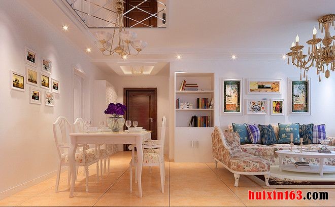 在电视背景墙上采用粉色底纹的碎花图案的壁纸装饰,在壁纸的两边设计了拼接玻璃镜面的装饰,给人的感觉不仅温馨,还充满了现代设计的时尚元素。在地面上铺设的是浅黄色的通体砖,在顶面上是一圈明亮的淡黄色的射灯,在客厅的中央是一盏金黄色的水晶灯,高达华美的外形瞬时提升了整个空间的层次。顶面一圈柔和灯光的射灯,会让人觉得整个空间都被星星给包围了。