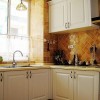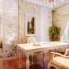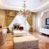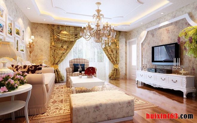 在客厅地面上采用深色的实木地板,清新的木纹,搭配碎花图案的窗帘,电视背景墙上的碎花图案的壁纸以及电视柜旁边摆放的一株翠绿色枝叶的绿树,让整个空间都洋溢着清新自然的气息。在地面上铺设的是简欧风格的地毯,地毯上面编制的也是大花图案,在沙发边几上也摆放着清新的粉色花朵,整个空间的设计的主题和自然与田园有千丝万缕的联系。优雅的欧式造型的吊灯和精美的金色水晶灯能够有效的提升空间的层次和格调。
