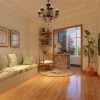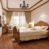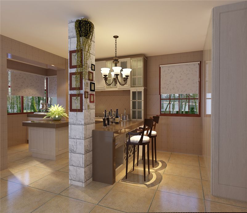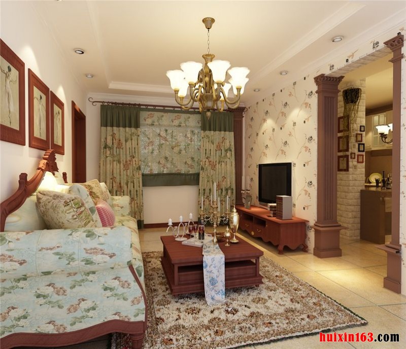 客厅本身的面积不是特别的大,窗子也不是落地窗子,室内的阳光不是特别的充足,很容易造成阴沉的感觉。设计师通过采用半高和全高两层的田园花纹的窗帘的设计,搭配墙面上白底浅色碎花图案的壁纸,营造出一个非常幽深宁静的田园格调。在地面上铺设浅黄色的通体砖,采用实木框架的沙发以及电视柜茶几作为主要的家具,在垭口的位置设计出土褐色的罗马立柱,在田园气息之中融入一些欧式宫廷的感觉,提升了整个空间的装饰格调。