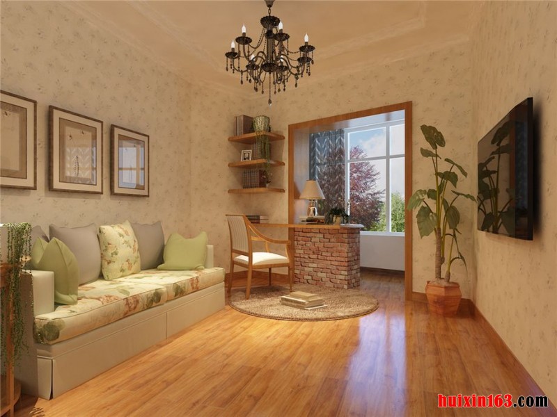 客厅本身的面积不是特别的大,窗子也不是落地窗子,室内的阳光不是特别的充足,很容易造成阴沉的感觉。设计师通过采用半高和全高两层的田园花纹的窗帘的设计,搭配墙面上白底浅色碎花图案的壁纸,营造出一个非常幽深宁静的田园格调。在地面上铺设浅黄色的通体砖,采用实木框架的沙发以及电视柜茶几作为主要的家具,在垭口的位置设计出土褐色的罗马立柱,在田园气息之中融入一些欧式宫廷的感觉,提升了整个空间的装饰格调。